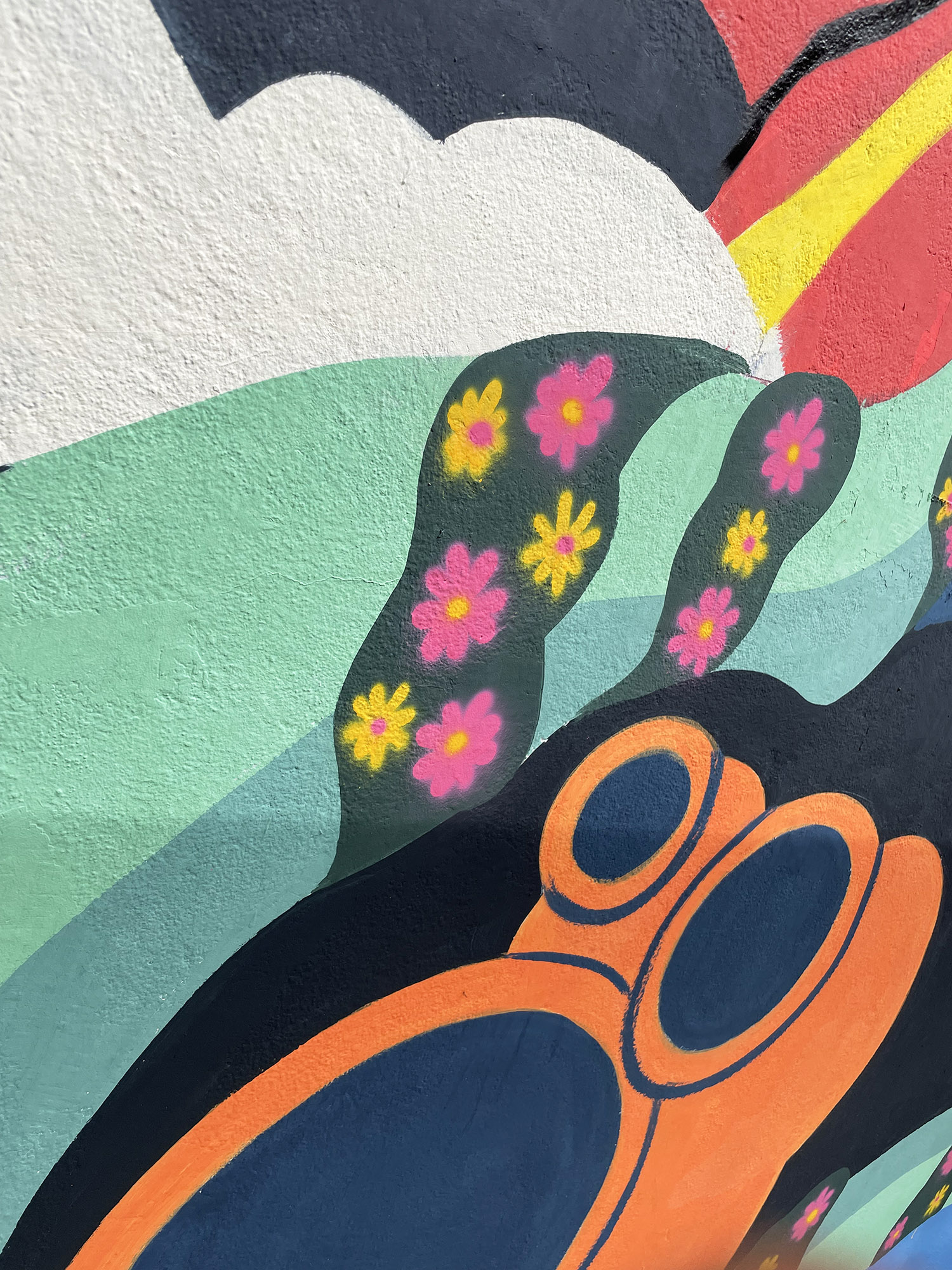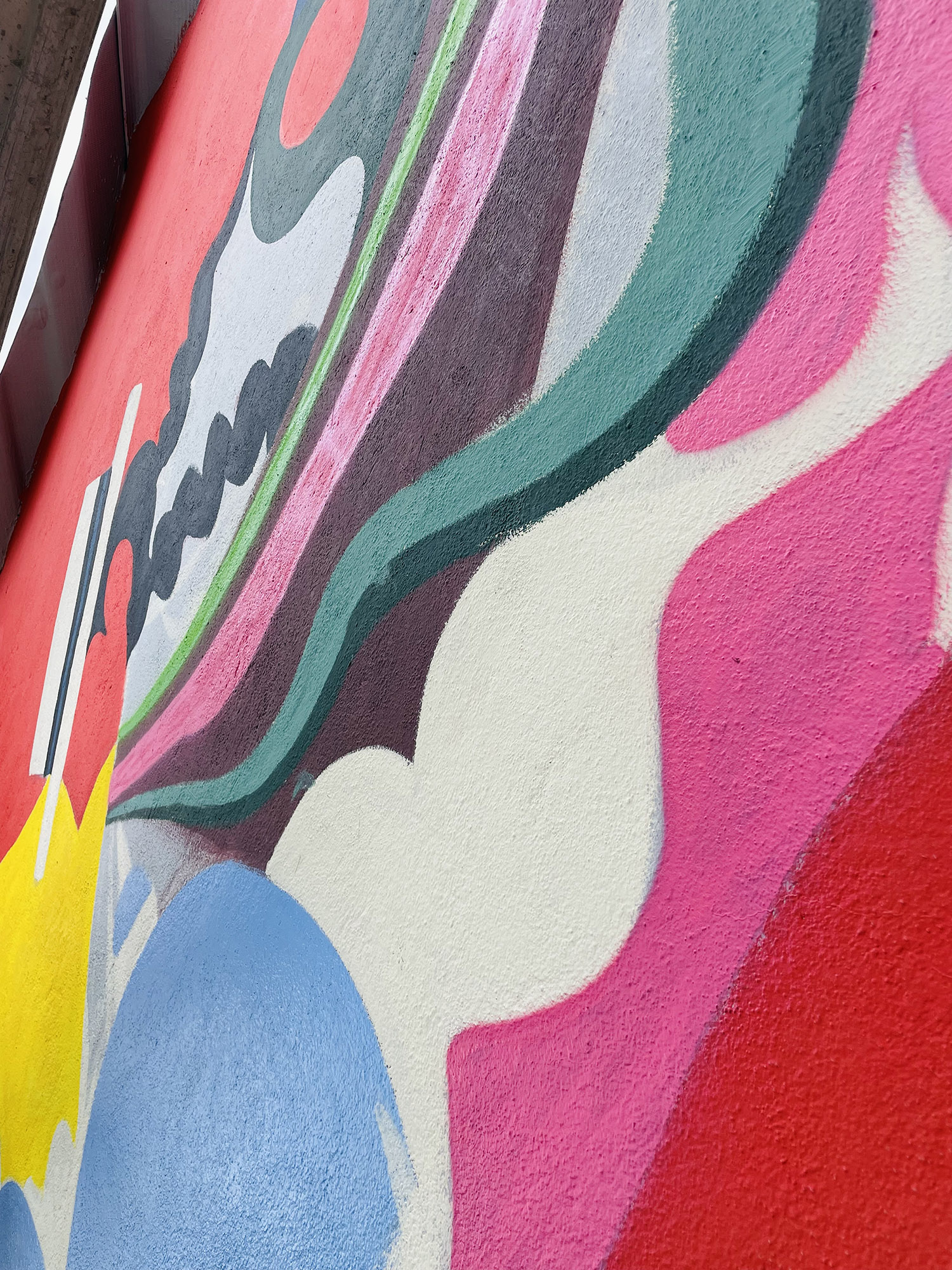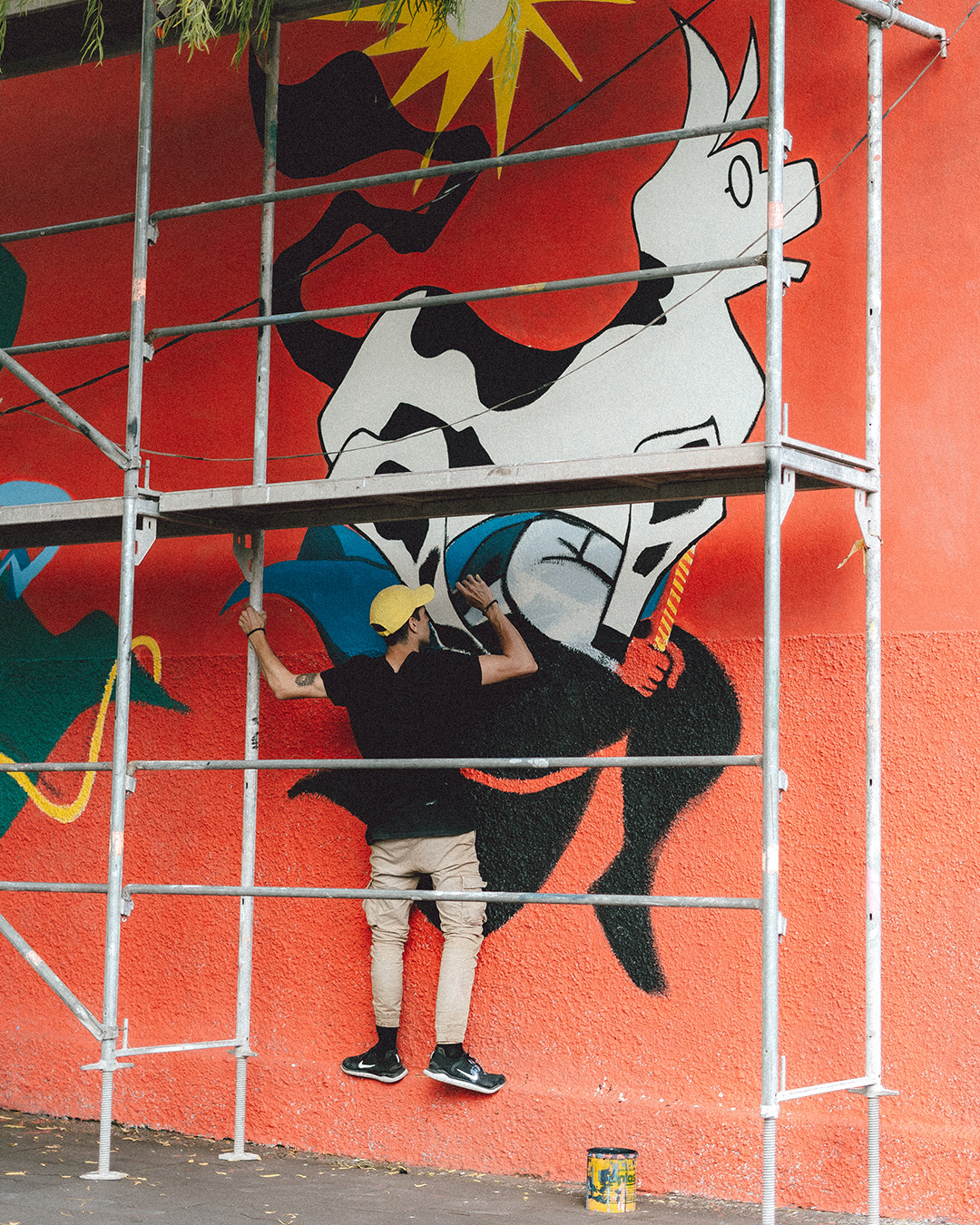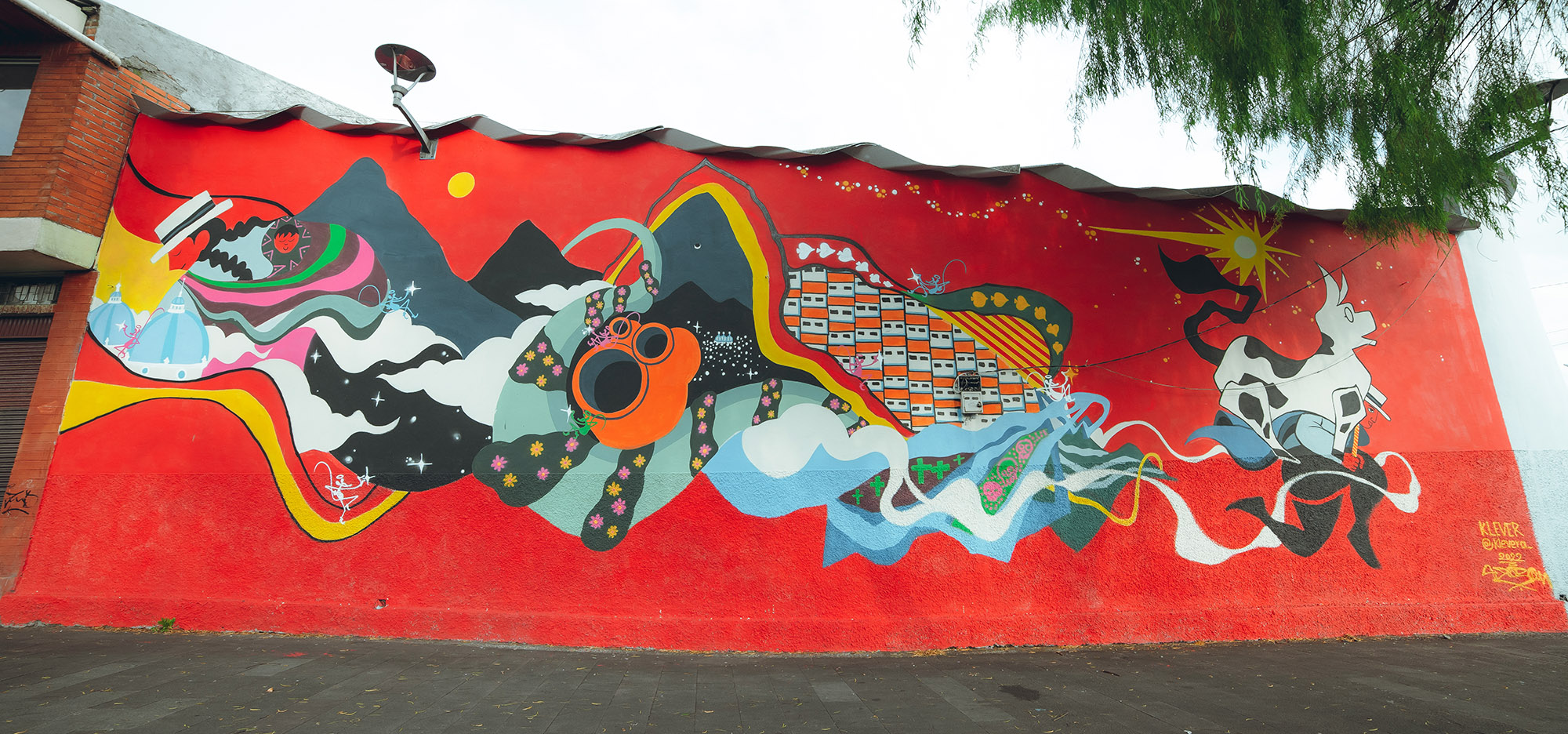 This mural is an homage to Cuenca, Ecuador. It's about the festive energy of the Runner carrying "La Vaca Loca", leaving behind the vibes of Cuenca as visual patterns.