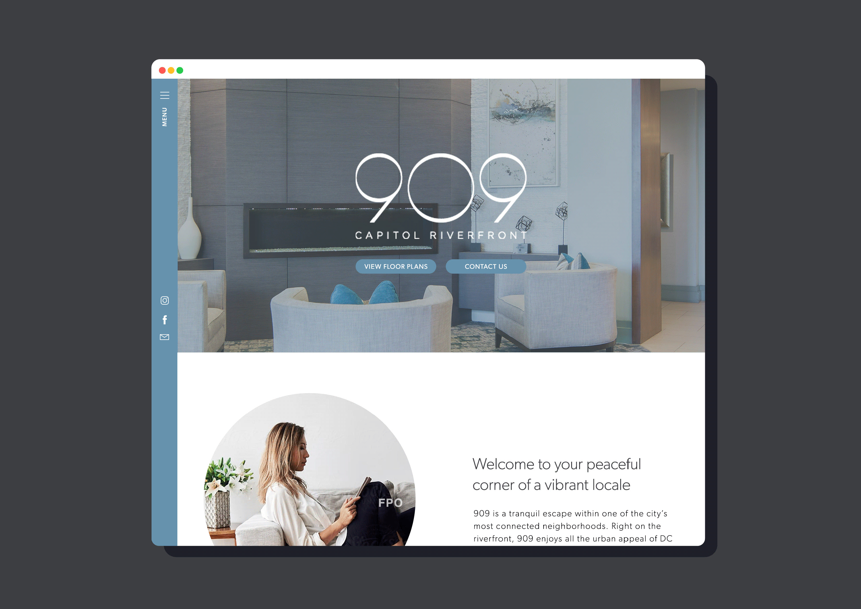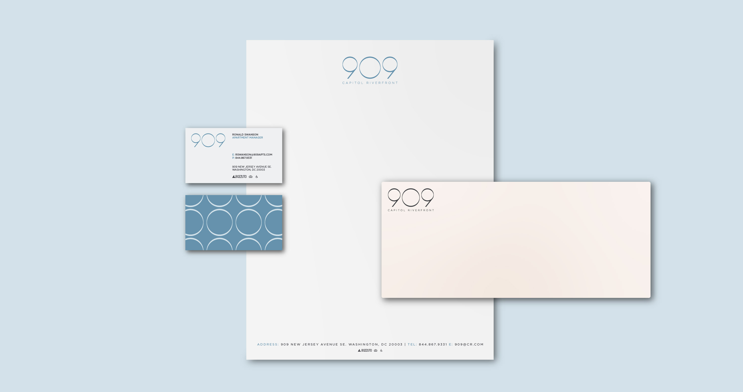 The Central location and classic design culminates in a residential experience that embodies warm, connecting living in the heart of DC. The word mark was created to emphasize the "O" as a graphic as it also gets communicated as code "nine O nine" through word of mouth.
