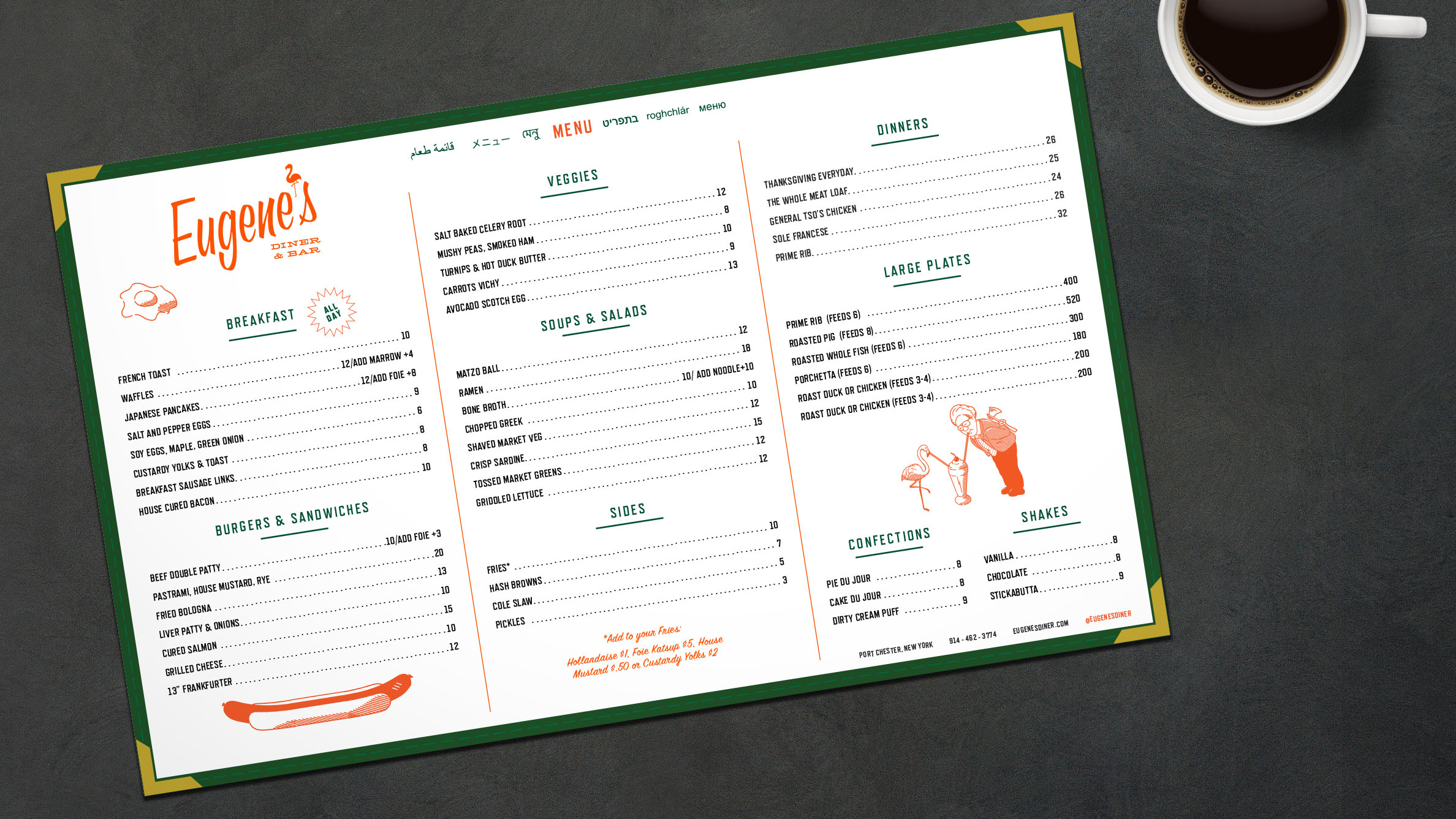 A feel-good diner-inspired restaurant & bar serving a new take on classic diner fare by people who cook serious and have fun. It seemed only fitting that (Chef) Dave Dibari would name his diner inspired restaurant after his grandfather: Eugene's Diner & Bar. Custom illustrations were made to enhance Eugene's brand Narrative.