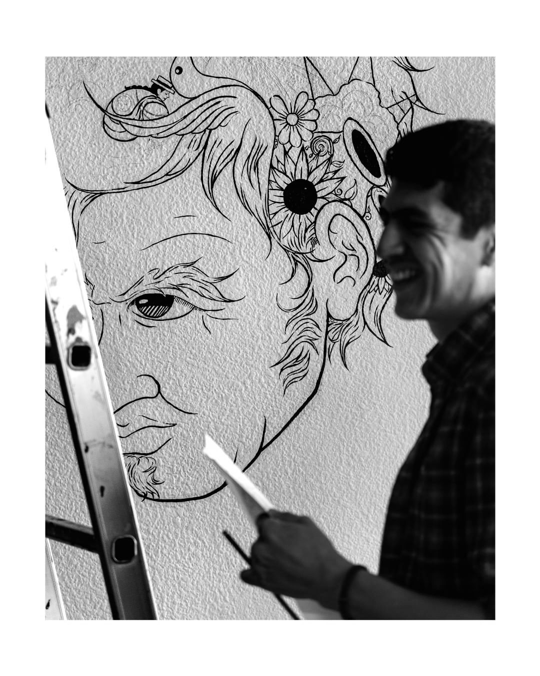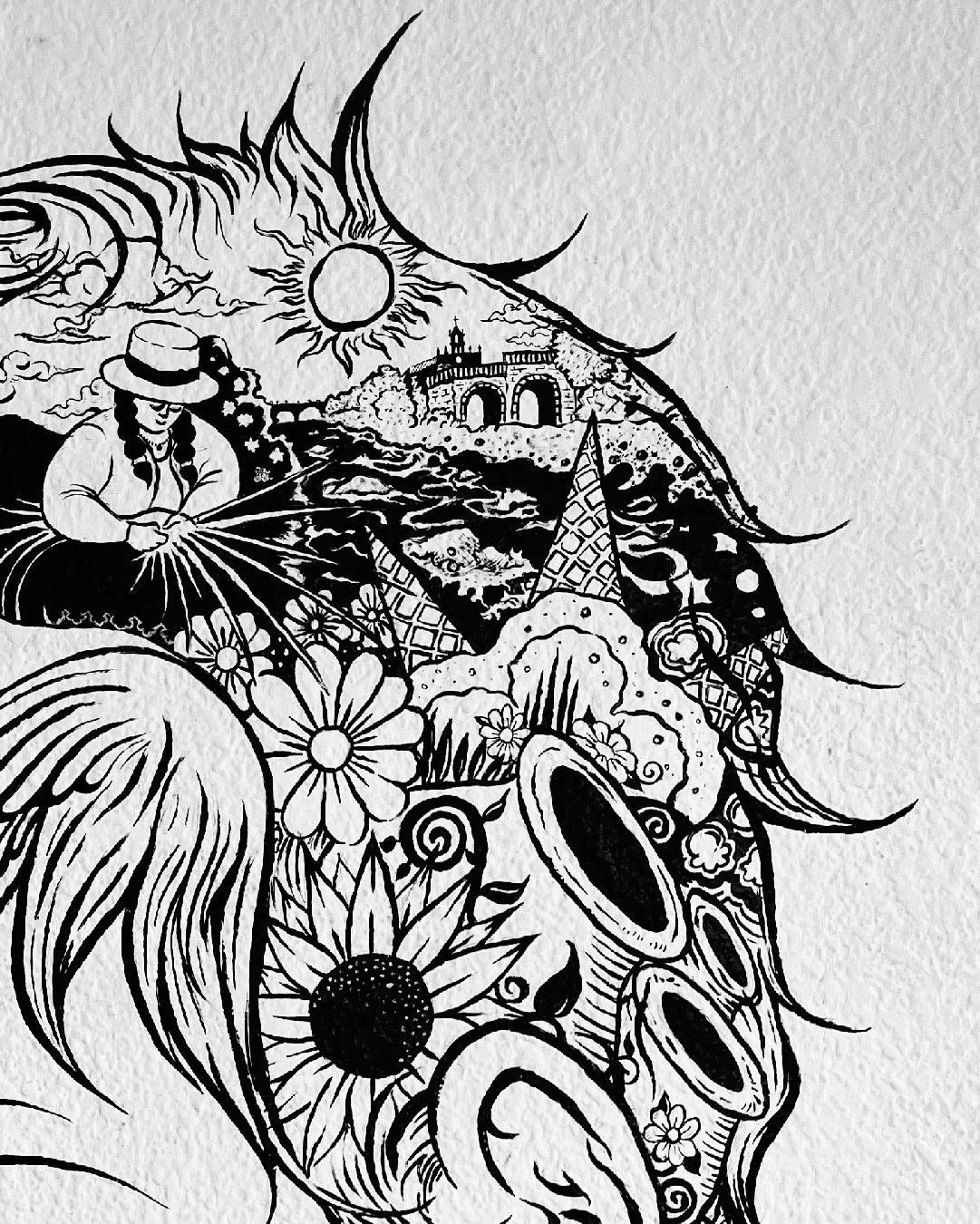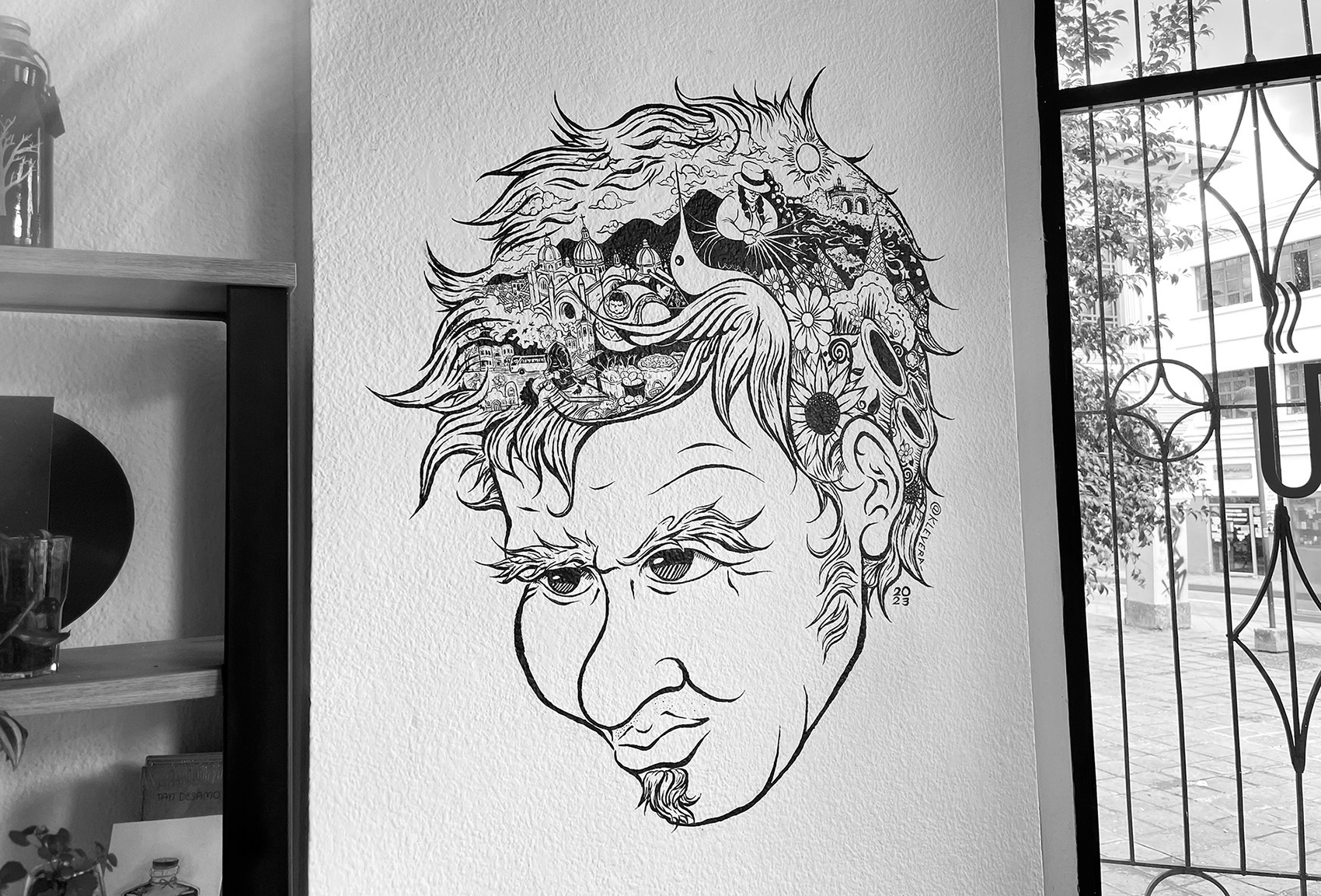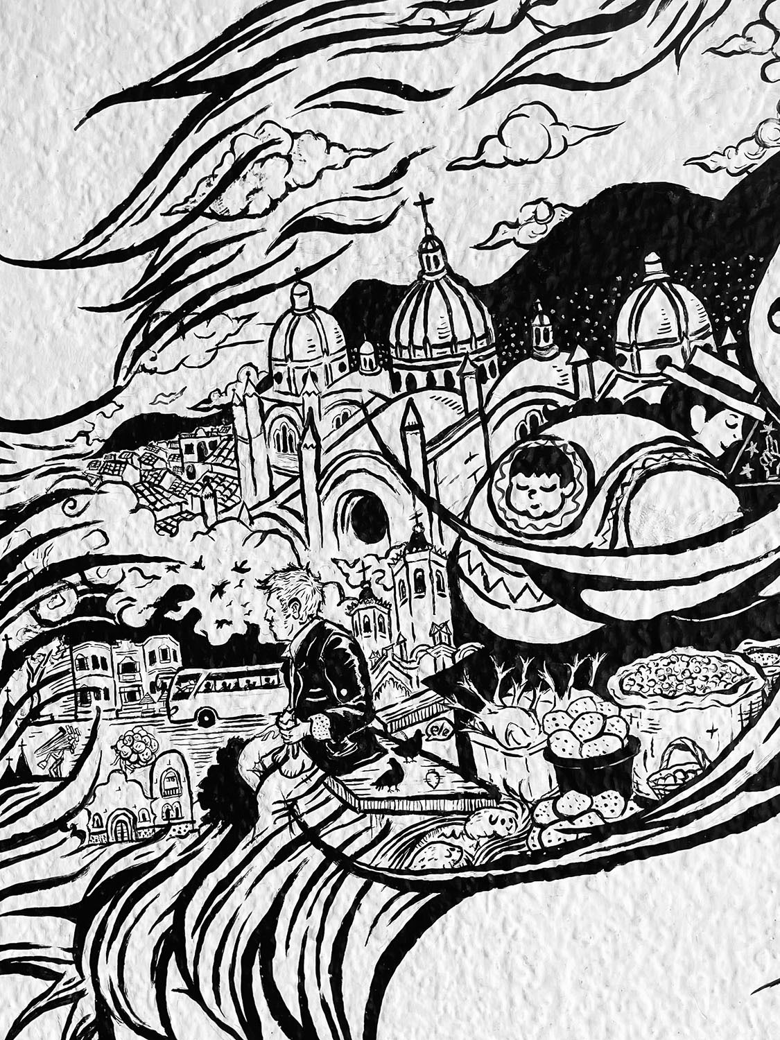 Luce con un saco grande, su cabello ondulado y rubio. De aquí nace el concepto y composición del mural; representando a Cuenca dentro un personaje Único. En detalle (dentro del cabello) esta todo lo que hace Cuenca, desde sus ríos, iglesias, cholas, buses, comida de mercado, y hasta las lomas en el horizonte.