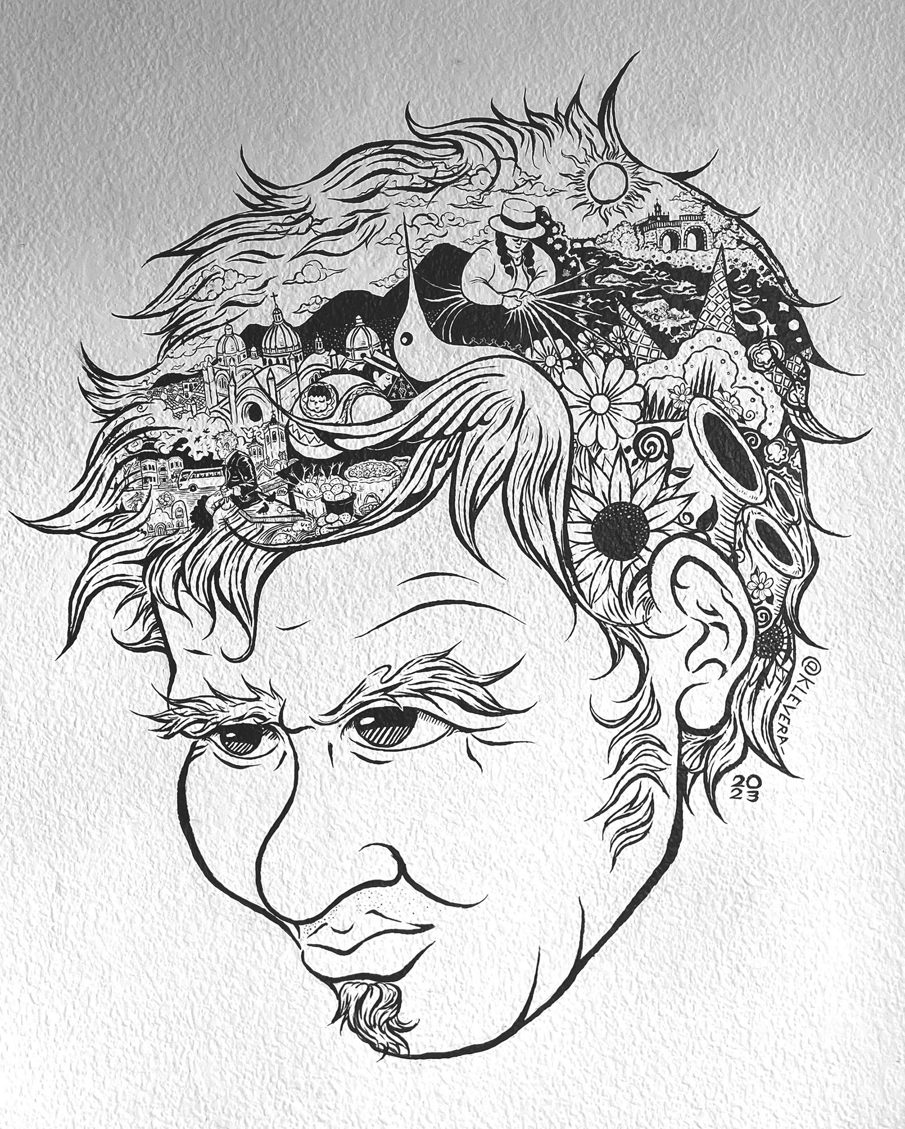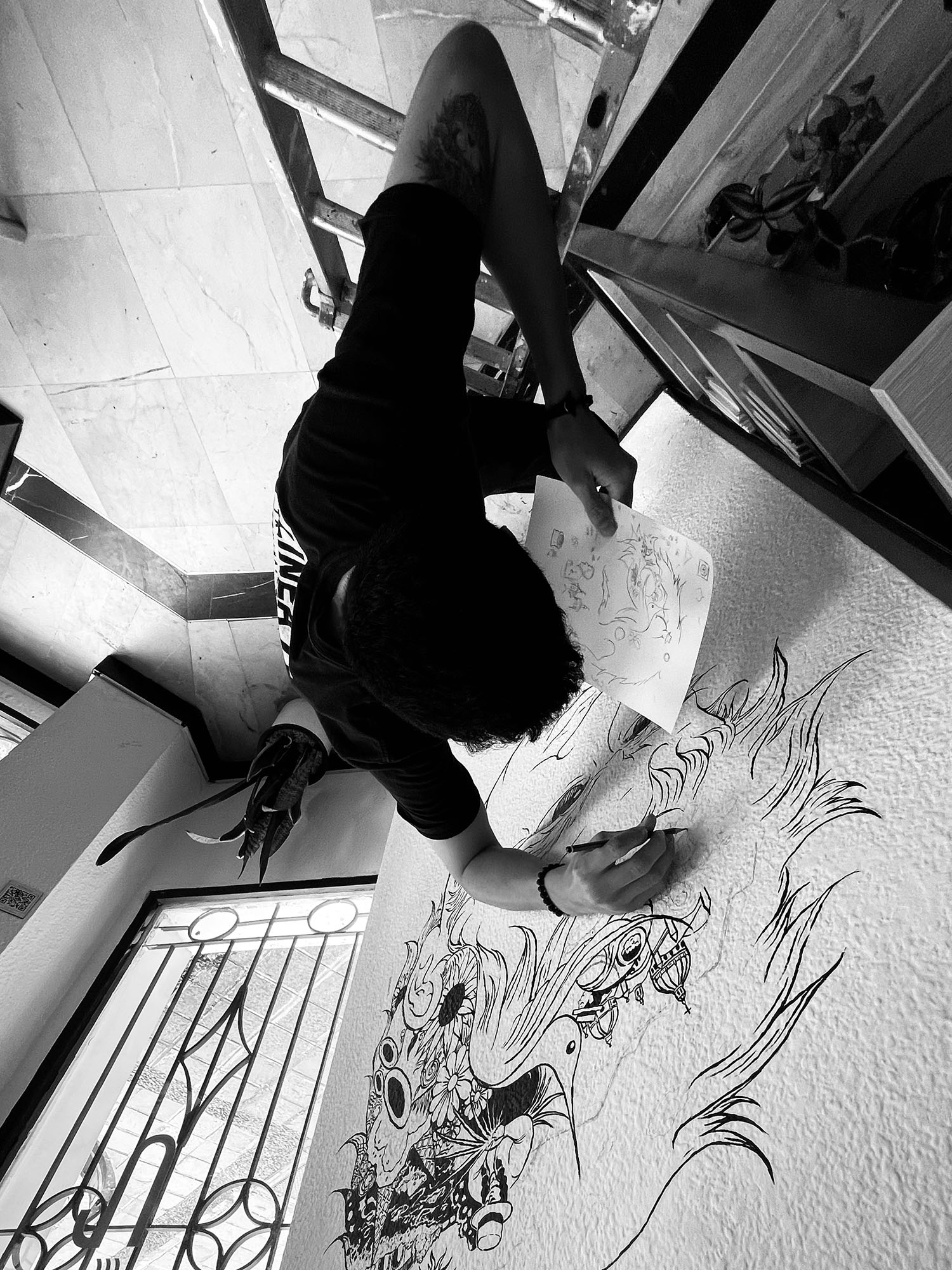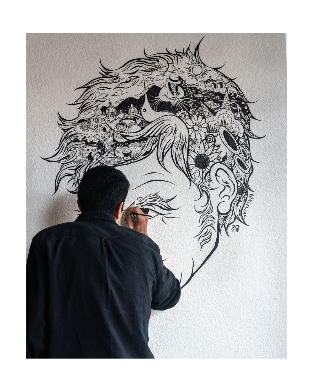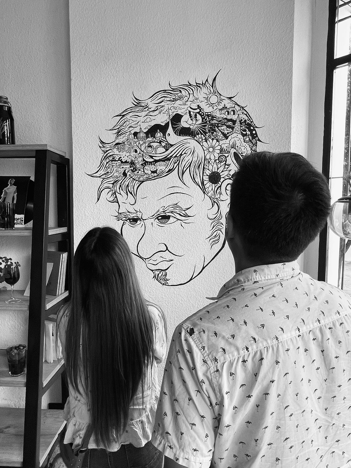 Luce con un saco grande, su cabello ondulado y rubio. De aquí nace el concepto y composición del mural; representando a Cuenca dentro un personaje Único. En detalle (dentro del cabello) esta todo lo que hace Cuenca, desde sus ríos, iglesias, cholas, buses, comida de mercado, y hasta las lomas en el horizonte.